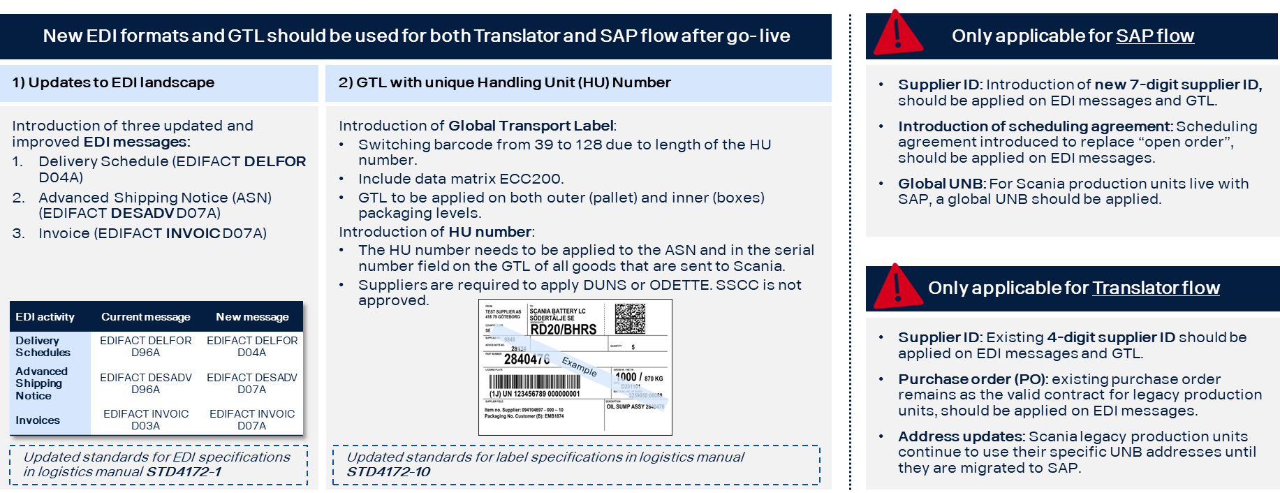 - Translator Flow – covers deliveries to Scania Legacy Production Units. The onboarding campaign includes conducting Legacy testing to enable go-live for the new EDI formats and label via the EDI translator across all Legacy production units (exception: call-offs from Scania Spare parts Centre (CW2, SP4, BW1, LPC) will continue to use the old set-up and label until further notice).