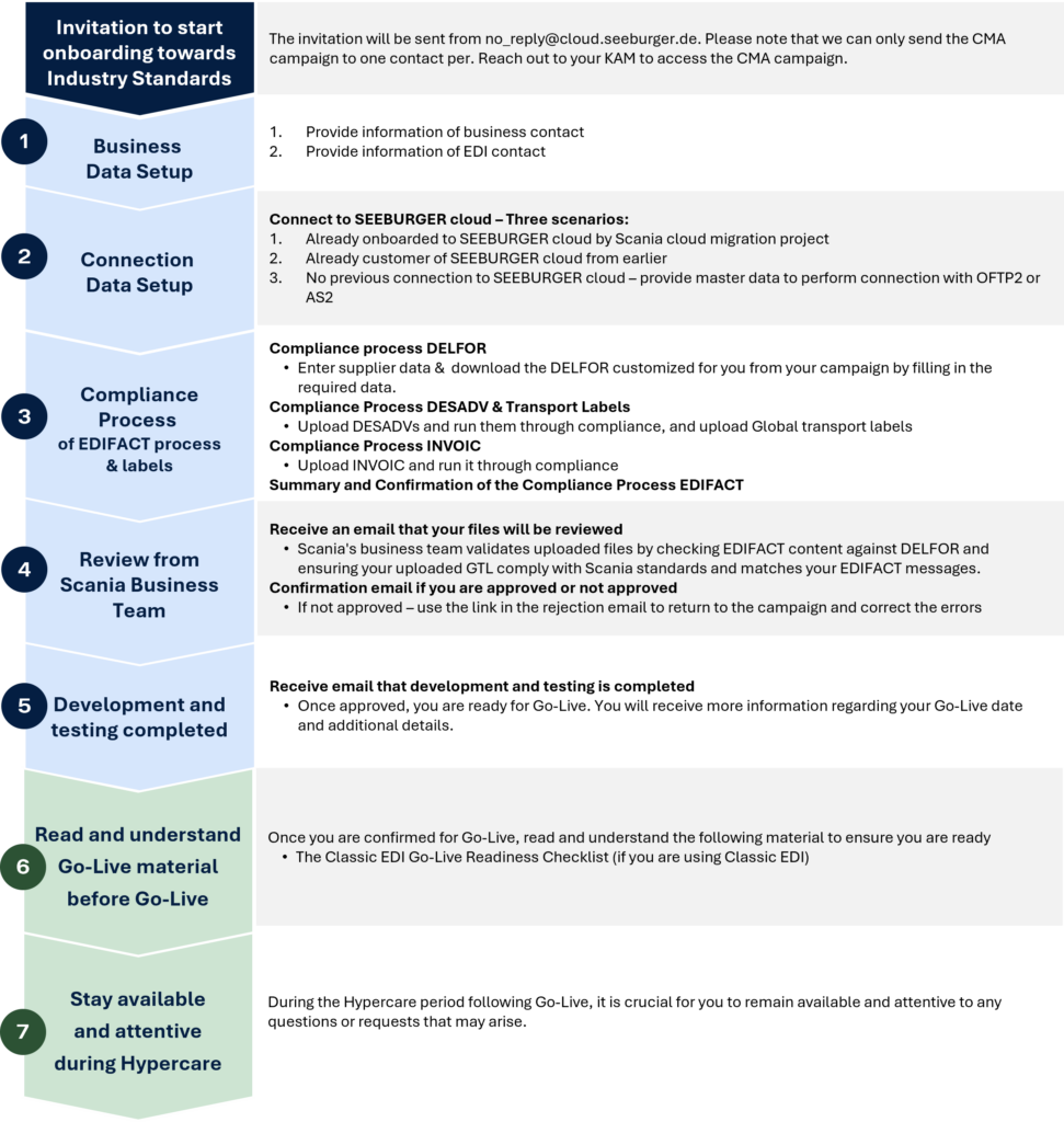As part of Scania Industry Standards Transformation, suppliers follow the integrated development and testing journey outlined on this page. To perform the development and testing of the new EDI message versions and the GTL, you will be invited to the digital CMA tool via SEEBURGER Cloud, Scania’s EDI Service Provider. In the CMA tool, you will complete your technical onboarding activities through your dedicated CMA onboarding campaign.